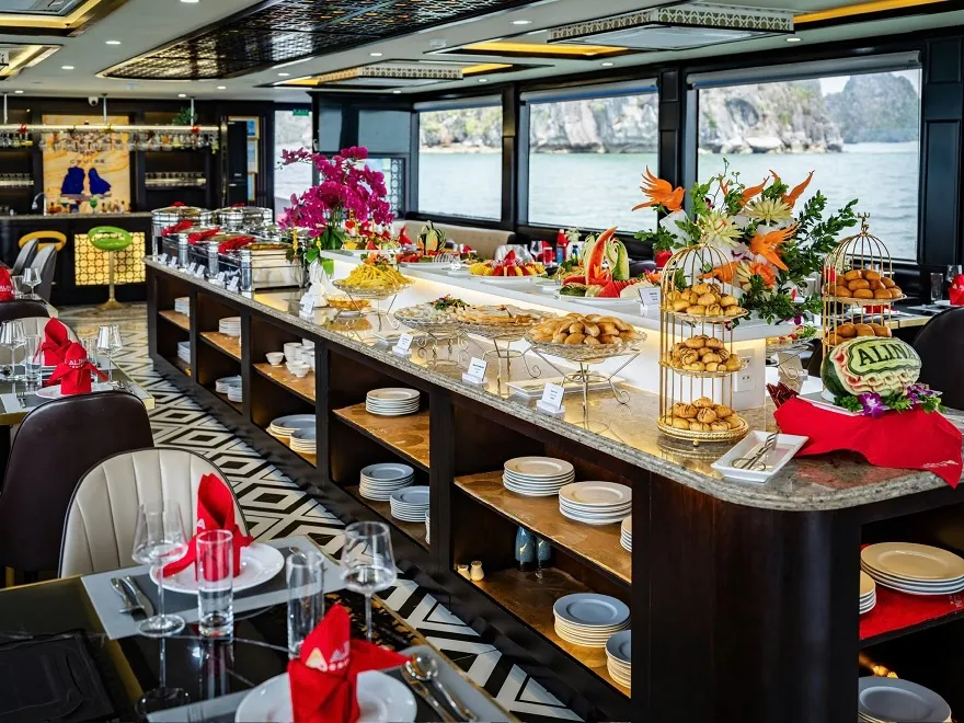 Hành trình khép lại bằng một trải nghiệm ẩm thực tinh tế ngay tại nhà hàng sang trọng của du thuyền. Bạn sẽ được thưởng thức bữa trưa thịnh soạn với những món hải sản tươi ngon nhất của vùng vịnh, cùng các món tráng miệng thanh mát. Vừa dùng bữa, vừa ngắm nhìn khung cảnh di sản lướt qua ngoài ô cửa là một cái kết hoàn hảo cho chuyến đi. Du thuyền sẽ cập bến Cảng tàu khách Quốc tế vào lúc 12:00, kết thúc một buổi sáng đáng nhớ trên Vịnh Hạ Long.