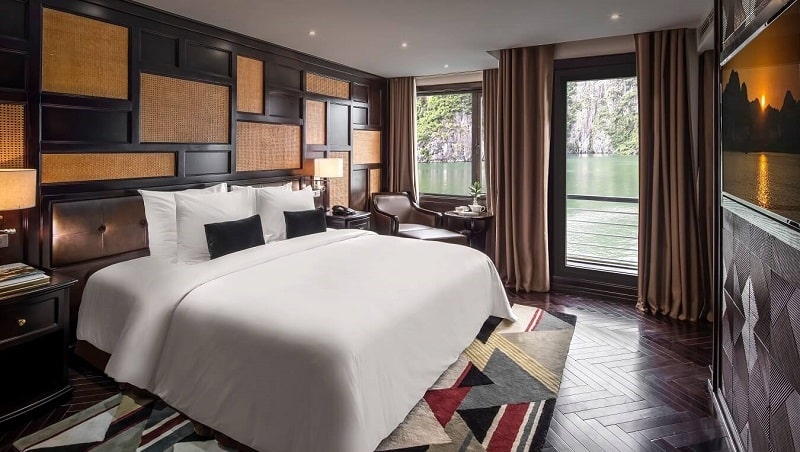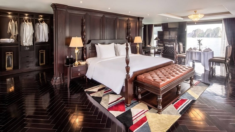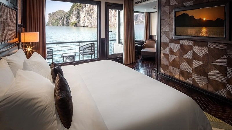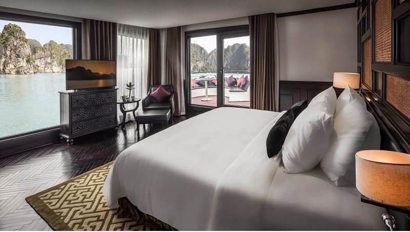 Một trong những niềm tự hào lớn nhất của Ambassador I chính là hệ thống 46 cabin sang trọng, được thiết kế để mang lại sự thoải mái và riêng tư tuyệt đối. Điểm nhấn đắt giá và khác biệt nhất chính là việc 100% cabin sở hữu ban công hoặc sân hiên riêng, mở ra tầm nhìn panorama ngoạn mục ra khung cảnh kỳ vĩ của Vịnh Hạ Long ngay từ chính căn phòng của bạn. Du thuyền mang đến 5 hạng phòng chính thức, đáp ứng đa dạng nhu cầu: Ambassador Deluxe (30m², Tầng 1) ấm cúng; Ambassador Premium (30m², Tầng 2 & 4) với tầm nhìn cao hơn; Ambassador Suite (42m², Tầng 2) rộng rãi cùng bồn tắm nằm thư giãn; Ambassador Captain Suite (45m², Tầng 2) tại vị trí mũi tàu đắc địa với bồn tắm nằm; và đỉnh cao là Presidential Suite (90m², Tầng 4) tựa như căn hộ xa hoa với phòng khách/ăn riêng, sân hiên cực rộng và bể sục Jacuzzi riêng đẳng cấp.
