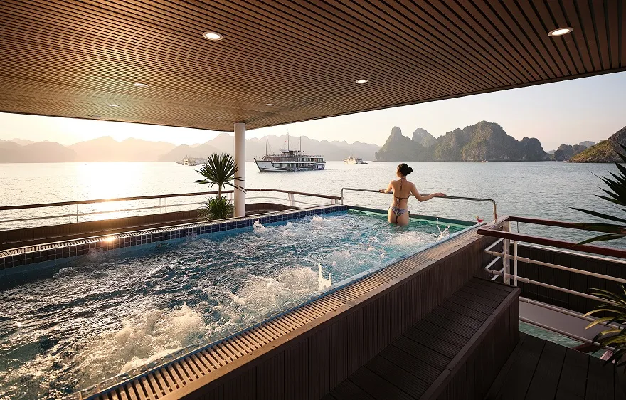 Điểm nhấn làm nên sự khác biệt của Du thuyền Diamond Cruise chính là những tiện ích độc đáo và dịch vụ được đầu tư kỹ lưỡng. Nổi bật nhất là bể sục Jacuzzi 4 mùa ngoài trời rộng rãi, nơi quý khách có thể thư giãn và chiêm ngưỡng toàn cảnh vịnh tuyệt đẹp. Bên cạnh đó, du thuyền còn cung cấp 8 phòng tắm tráng miễn phí với khăn tắm sạch sẽ, đảm bảo sự thoải mái tối đa cho du khách sau các hoạt động trên vịnh. Nhà hàng sang trọng trên tàu sẵn sàng phục vụ bữa trưa buffet đẳng cấp với hơn 30 món ăn, đa dạng từ hải sản tươi ngon đến các món Á-Âu đặc sắc. Đặc biệt, Diamond Cruise tiên phong với không gian và thực đơn riêng biệt dành cho du khách Ấn Độ, khẳng định sự quan tâm đến mọi nền văn hóa ẩm thực. Ngoài ra, du thuyền còn có sân khấu biểu diễn nhạc cổ điển, dân tộc và khu Lounge thư giãn trên Sundeck, hứa hẹn mang đến những giây phút giải trí đáng nhớ. Tất cả được vận hành bởi đội ngũ nhân viên dày dặn kinh nghiệm trong lĩnh vực du thuyền 5 sao và hướng dẫn viên chuyên nghiệp, am hiểu, luôn sẵn sàng phục vụ để chuyến đi của quý khách trở nên hoàn hảo và đáng nhớ nhất.