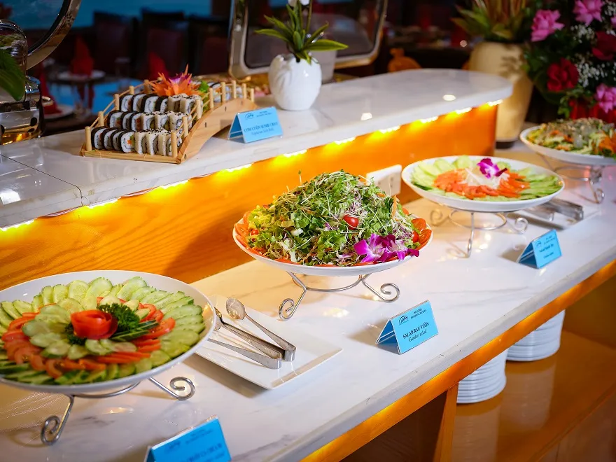 10:00 – 10:50: Thưởng thức bữa trưa buffet sang trọng Quý khách sẽ dùng bữa trưa buffet tại nhà hàng đẳng cấp trên tàu. Thực đơn phong phú với các món ăn truyền thống Việt Nam, đa dạng món Âu Á và đặc biệt là hải sản tươi ngon, đặc sắc của vùng biển Hạ Long, đảm bảo mang lại trải nghiệm ẩm thực hài lòng giữa không gian vịnh tuyệt đẹp.