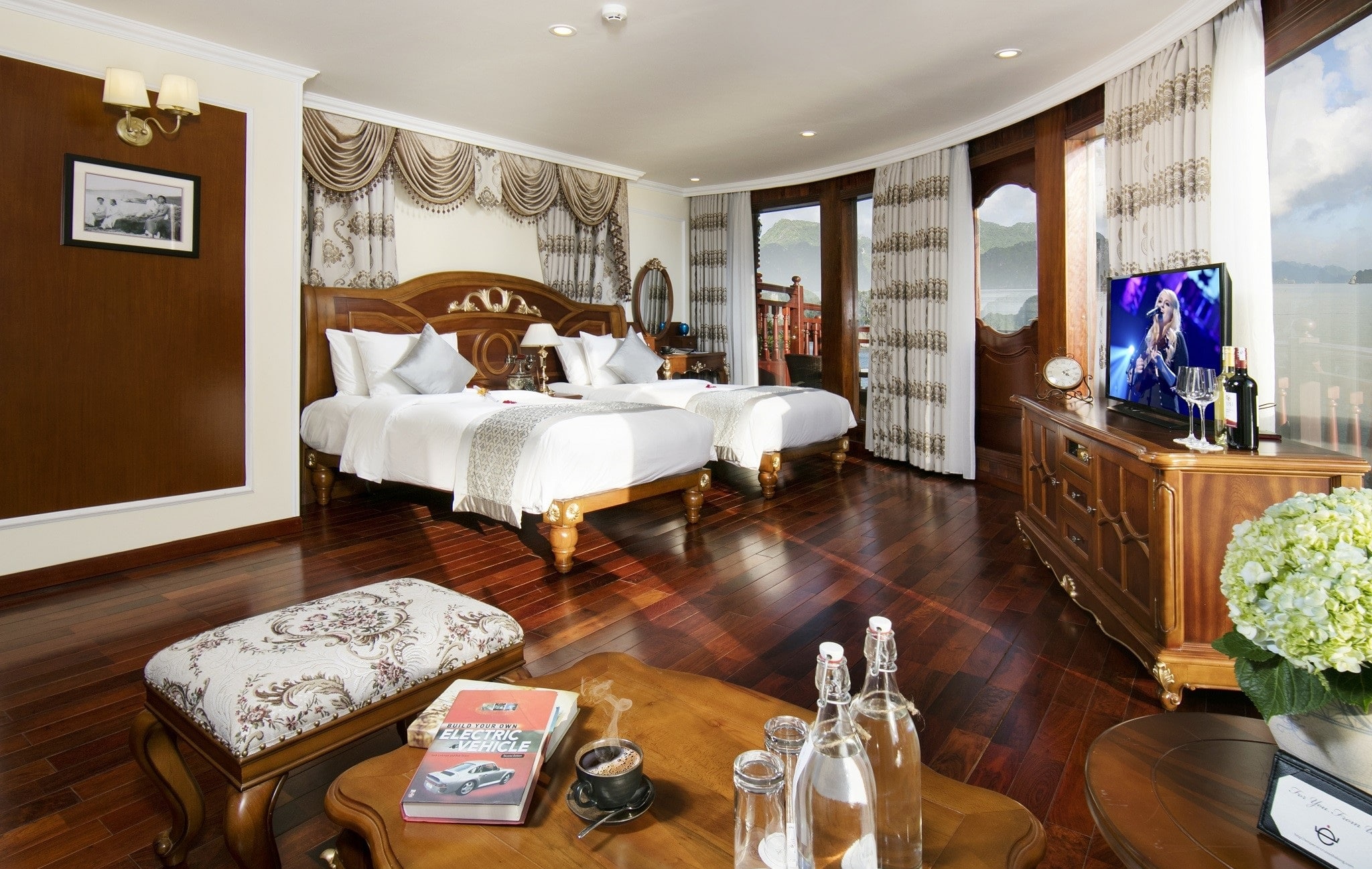 | • Phòng ngủ rộng rãi từ 35m2 – 70m2, sang trọng với tầm nhìn toàn cảnh ra Vịnh và có ban công riêng theo PANORAMA concept • 7 trải nghiệm ẩm thực tại bữa tiệc Hoàng Gia trong hành trình 3 ngày 2 đêm: 02 bữa trưa, 02 bữa tối, 02 bữa sáng, 01 bữa trưa nhẹ ngày về • Tiệc trà đón hoàng hôn với âm nhạc và canapes • Thực đơn 24h trong phòng theo yêu cầu • Cung cấp máy nghe nhạc (khi được yêu cầu) • Các hoạt động và vé thăm quan trong chương trình • Tour thăm quan tàu và giới thiệu về bộ sưu tập tranh và giới thiệu về các biệt điện của vua Bảo Đại (tùy chọn) • Dịch vụ quản gia và phục vụ bữa sáng nhẹ tại phòng (tùy chọn) |