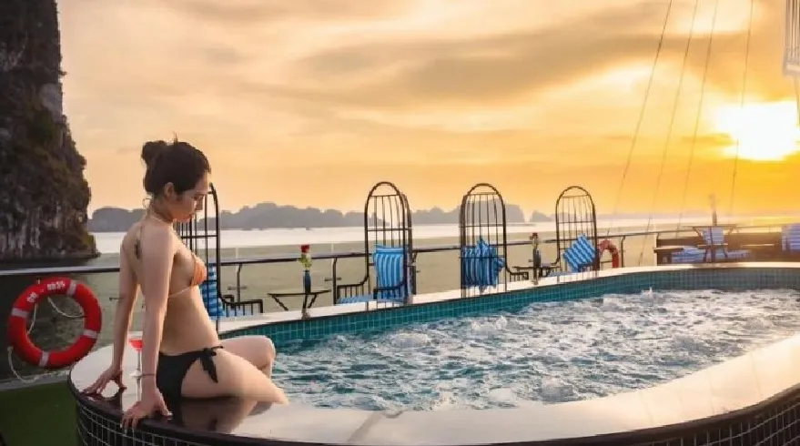 16:00: Trở lại du thuyền và tham gia tiệc hoàng hôn Sunset party sôi động. Nhâm nhi snack và trái cây tươi ngon, ngâm mình thư giãn trong bể jacuzzi, ngắm nhìn khoảnh khắc mặt trời buông xuống Vịnh Hạ Long, tạo nên bức tranh thiên nhiên tuyệt mỹ.