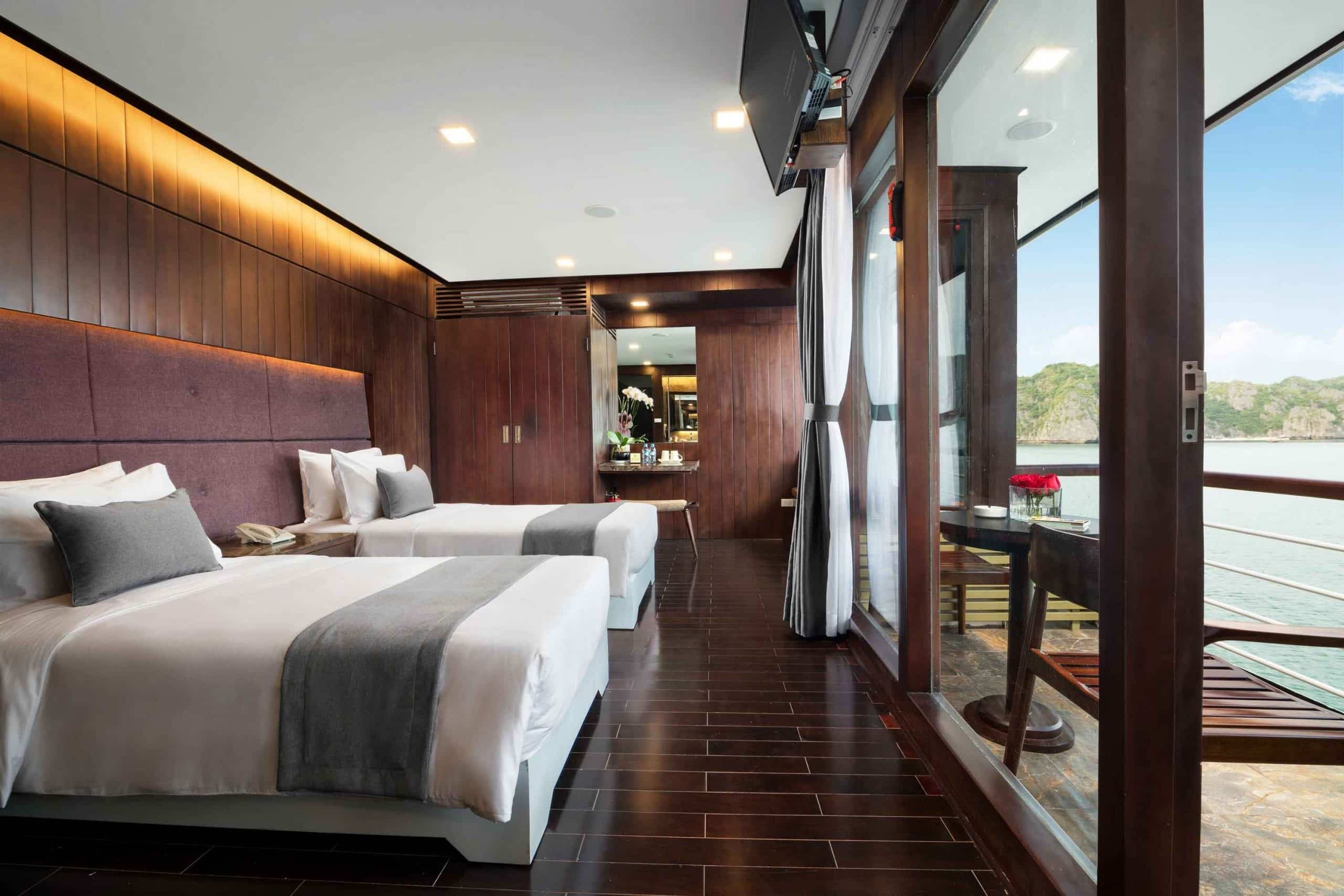 Hệ thống phòng nghỉ được phân chia thành các hạng phòng đáp ứng đa dạng nhu cầu. Phòng Suite (36m², 8 phòng/tàu, tầng 1) mang đến không gian ấm cúng với giường lớn hoặc hai giường đơn, ban công và bồn tắm riêng, phù hợp cho cặp đôi hoặc bạn bè. Phòng Premium Suite (36m², 4 phòng/tàu, tầng 2) sở hữu các tiện nghi tương tự nhưng có ưu thế về vị trí tầng cao hơn, mang lại tầm nhìn bao quát và thoáng đãng hơn. Đẳng cấp nhất là Phòng Exclusive Suite (45m², 2 phòng/tàu, tầng 2), hạng phòng rộng rãi nhất với giường tròn độc đáo, ban công cực rộng có ghế ngả thư giãn, phòng tắm lớn nhất với bồn tắm panorama hướng vịnh, lý tưởng cho những kỳ nghỉ trăng mật hay dịp kỷ niệm đặc biệt.